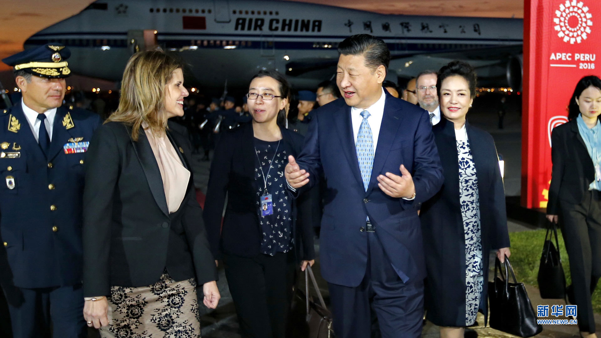 當地時間11月18日,國家主席習近平抵達利馬,出席亞太經合組織第二十四次領導人非正式會議并對秘魯共和國進行國事訪問。習近平和夫人彭麗媛受到秘魯副總統(tǒng)阿勞斯等熱情迎接。新華社記者 丁林 攝2016-11-20