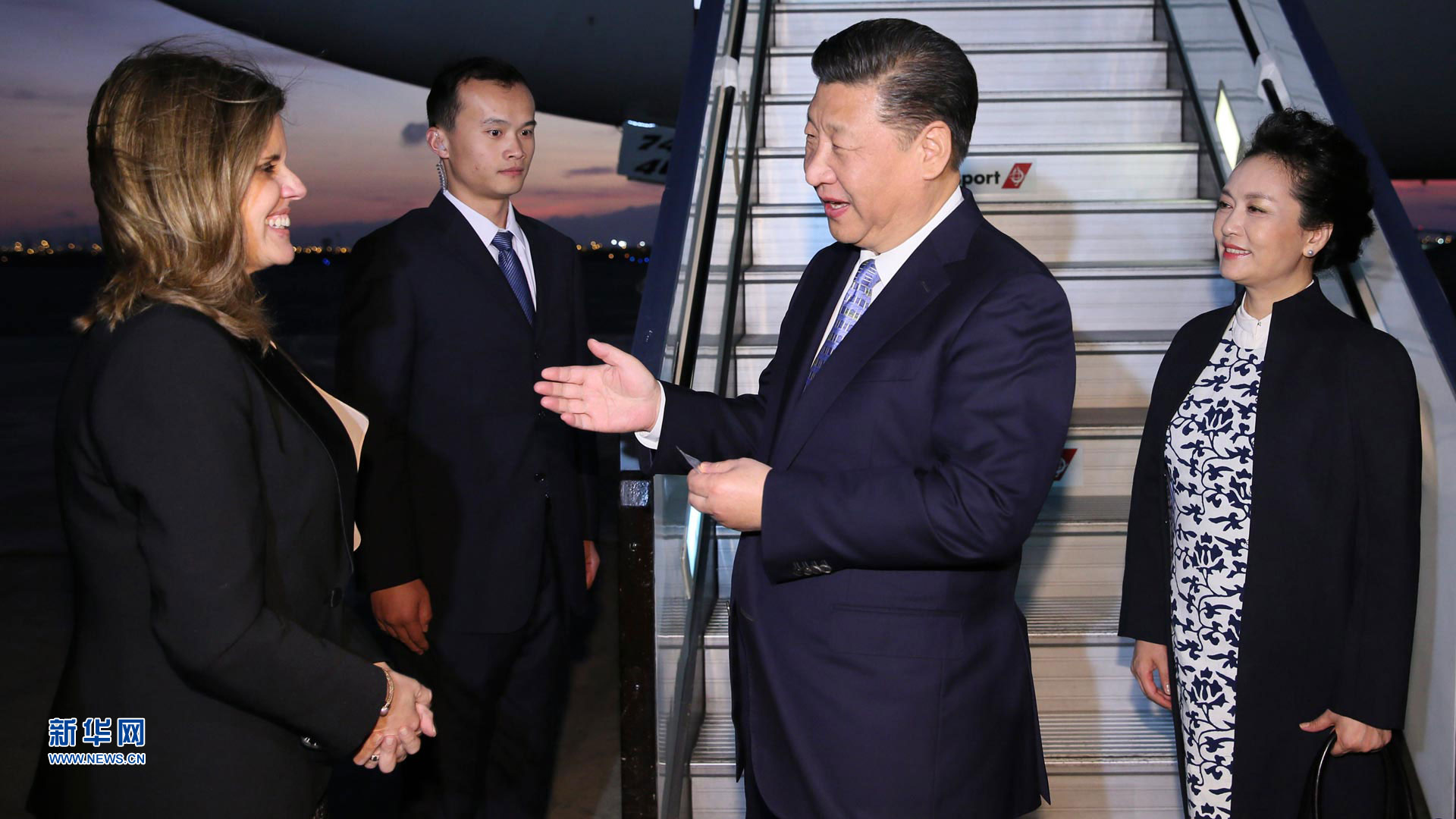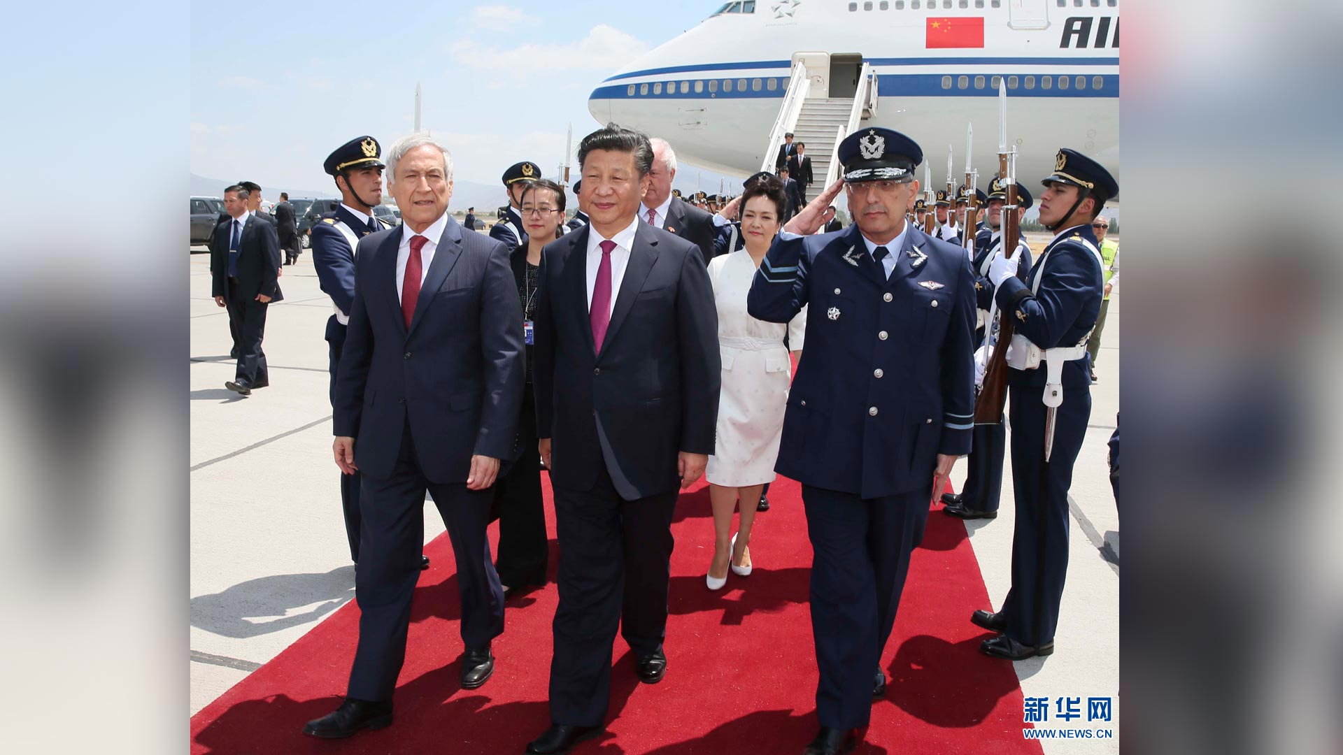 11月22日,國家主席習近平抵達圣地亞哥,對智利共和國進行國事訪問。智利外長穆尼奧斯等在機場迎接習近平和夫人彭麗媛。 新華社記者蘭紅光 攝2016-11-23