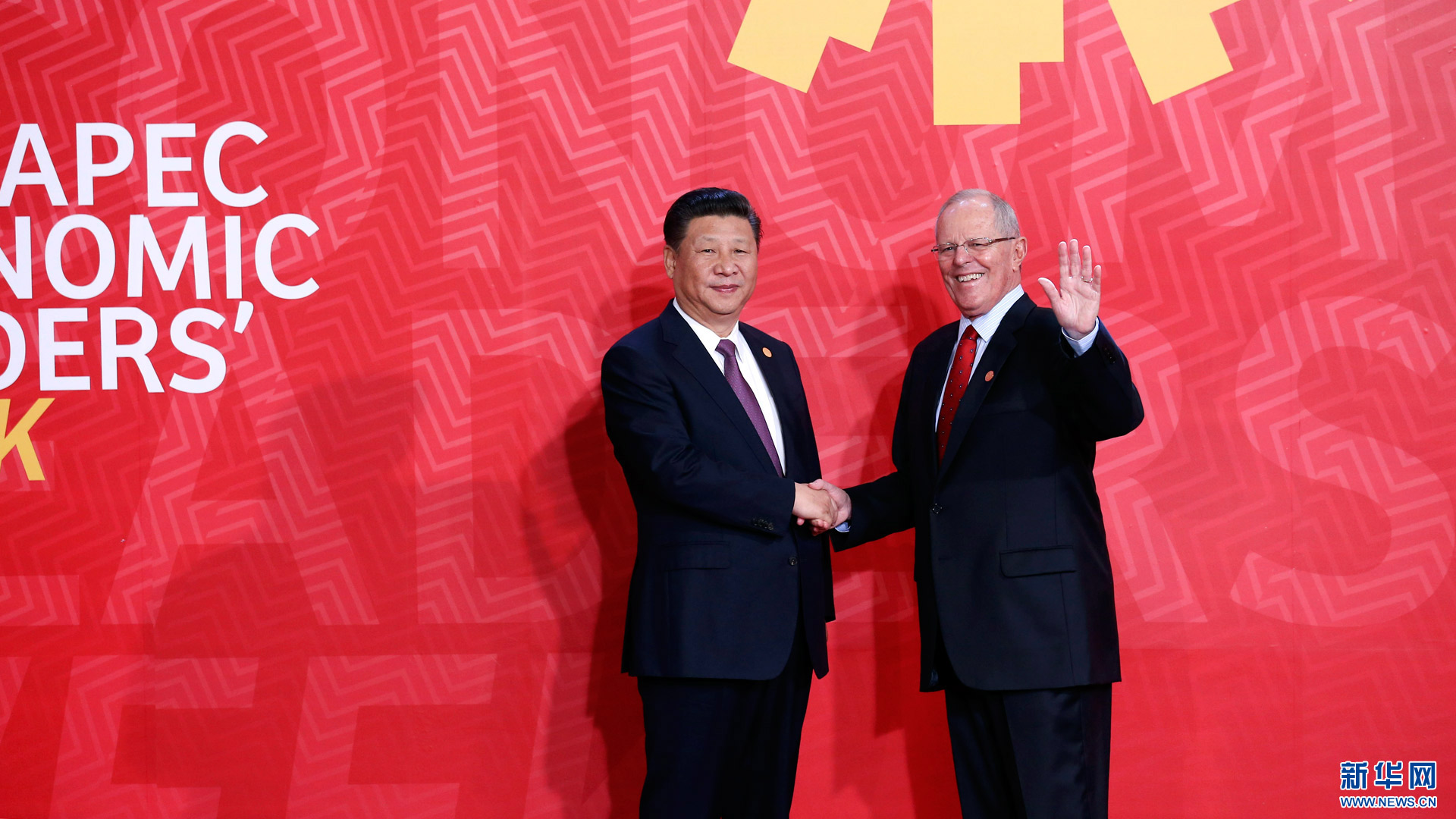 11月20日,亞太經合組織第二十四次領導人非正式會議在秘魯利馬舉行。國家主席習近平出席并發(fā)表題為《面向未來開拓進取促進亞太發(fā)展繁榮》的重要講話。這是會議開始前,習近平受到秘魯總統(tǒng)庫琴斯基的熱情迎接。 新華社記者 龐興雷 攝2016-11-21
