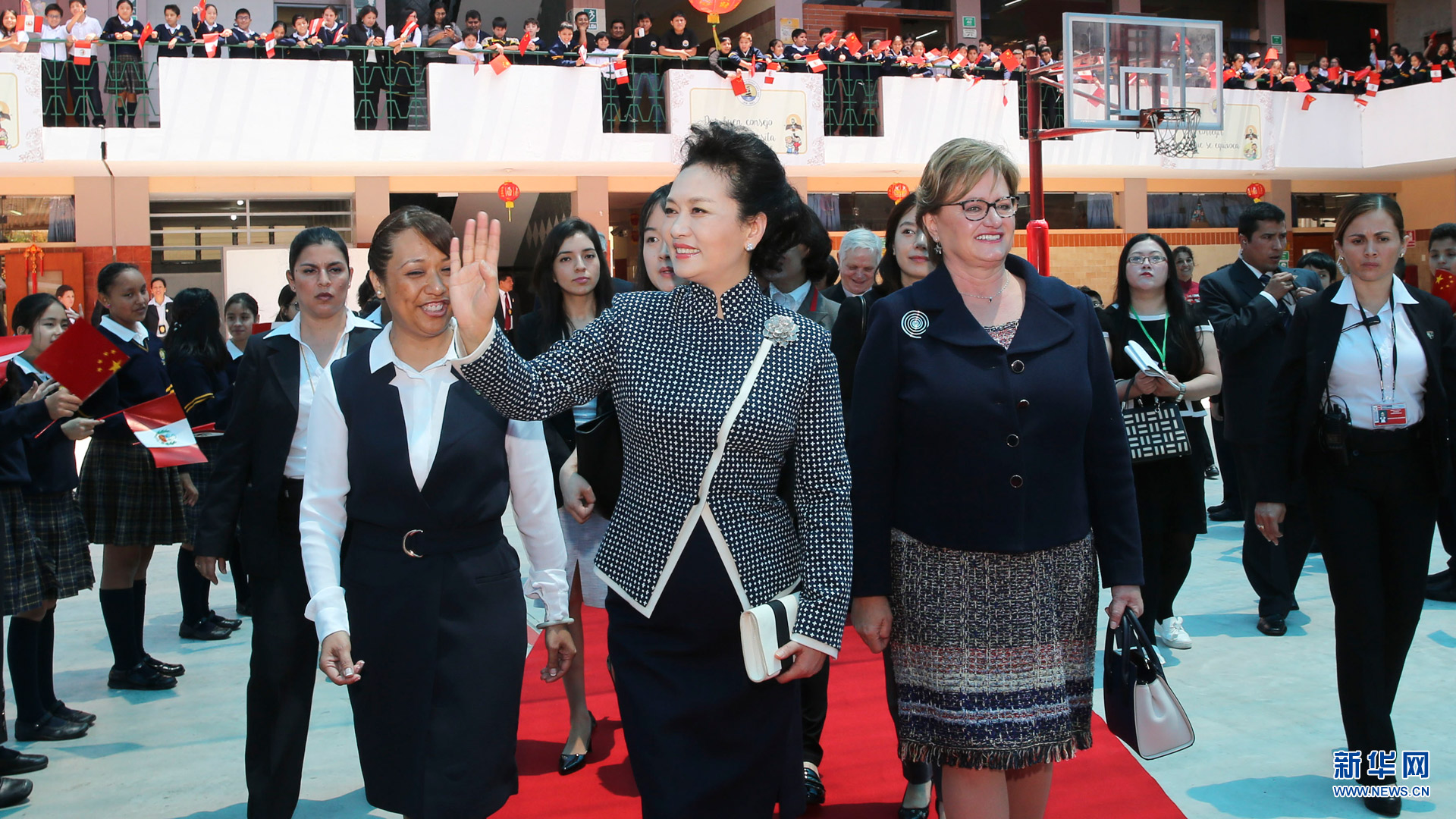 11月21日,國家主席習近平夫人彭麗媛在利馬參觀若望二十三世秘中學校。 新華社記者丁林攝2016-11-22
