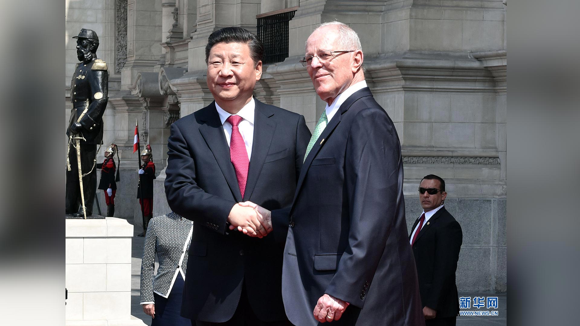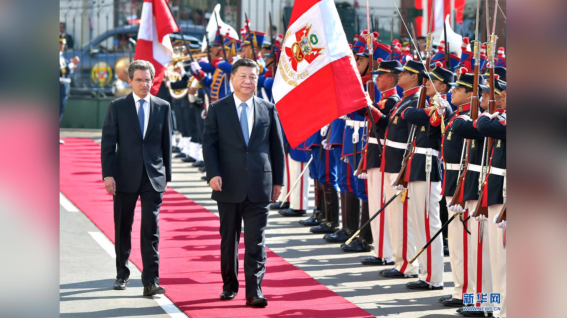 11月21日,國家主席習近平在利馬同秘魯總統(tǒng)庫琴斯基舉行會談。會談前,習近平出席庫琴斯基在總統(tǒng)府前廣場舉行的歡迎儀式。 新華社記者李濤 攝2016-11-23