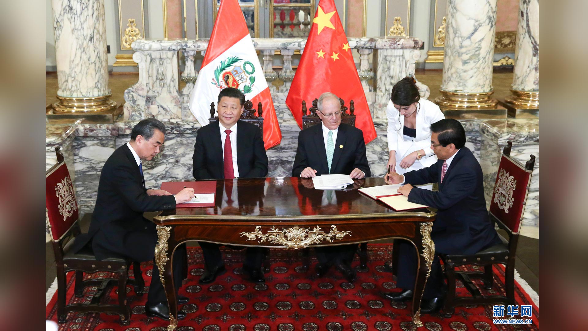 11月21日,國家主席習近平在利馬同秘魯總統(tǒng)庫琴斯基舉行會談。會談后,兩國元首見證《中華人民共和國政府與秘魯共和國政府2016年至2021年共同行動計劃》等文件的簽署。新華社記者 龐興雷 攝2016-11-23