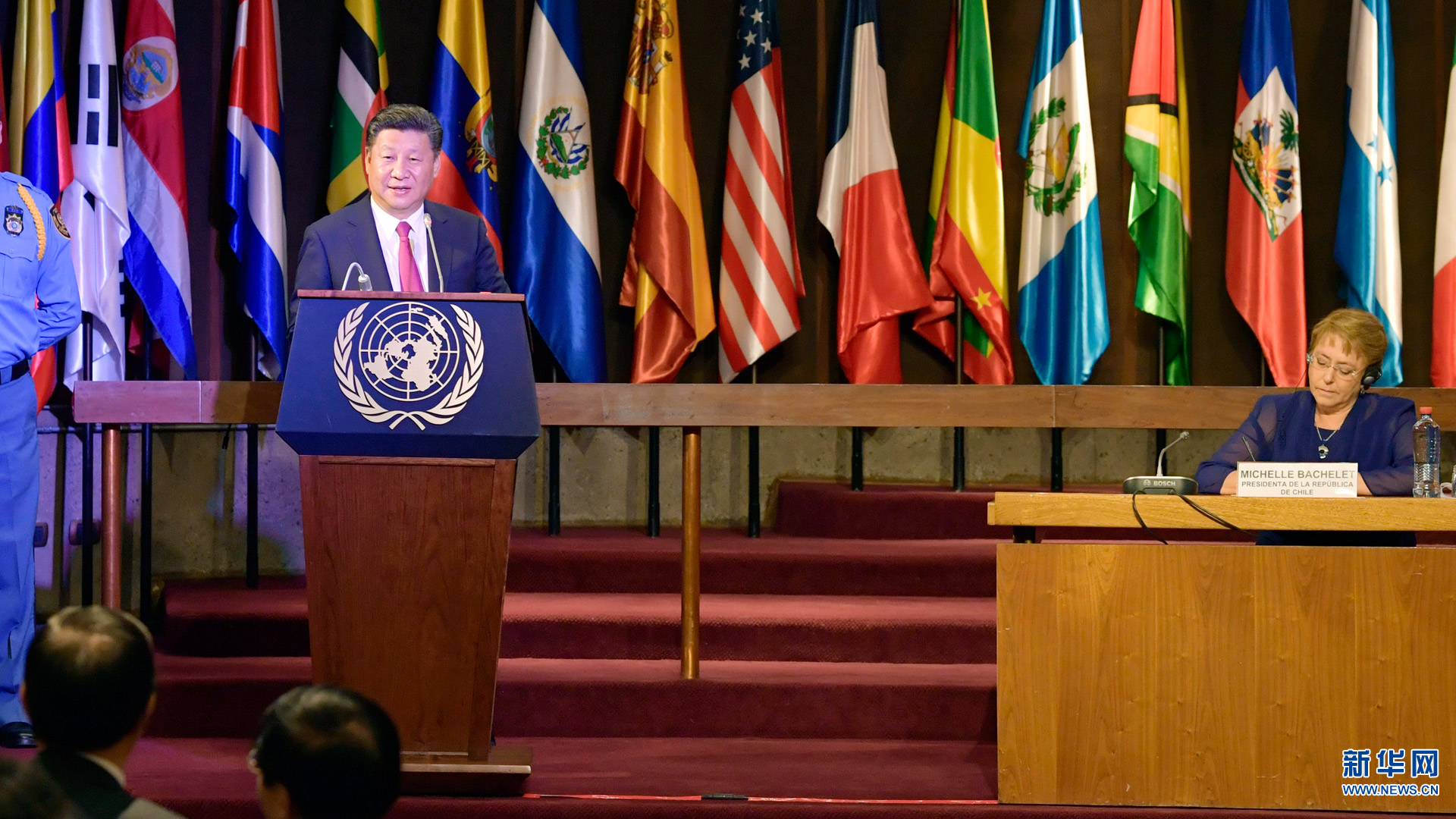 11月22日,國家主席習近平在圣地亞哥聯合國拉丁美洲和加勒比經濟委員會總部出席中拉媒體領袖峰會開幕式。智利總統(tǒng)巴切萊特陪同出席。在熱烈的掌聲中,習近平發(fā)表題為《開創(chuàng)中拉媒體合作新局面》的致辭。新華社記者 王曄 攝2016-11-23