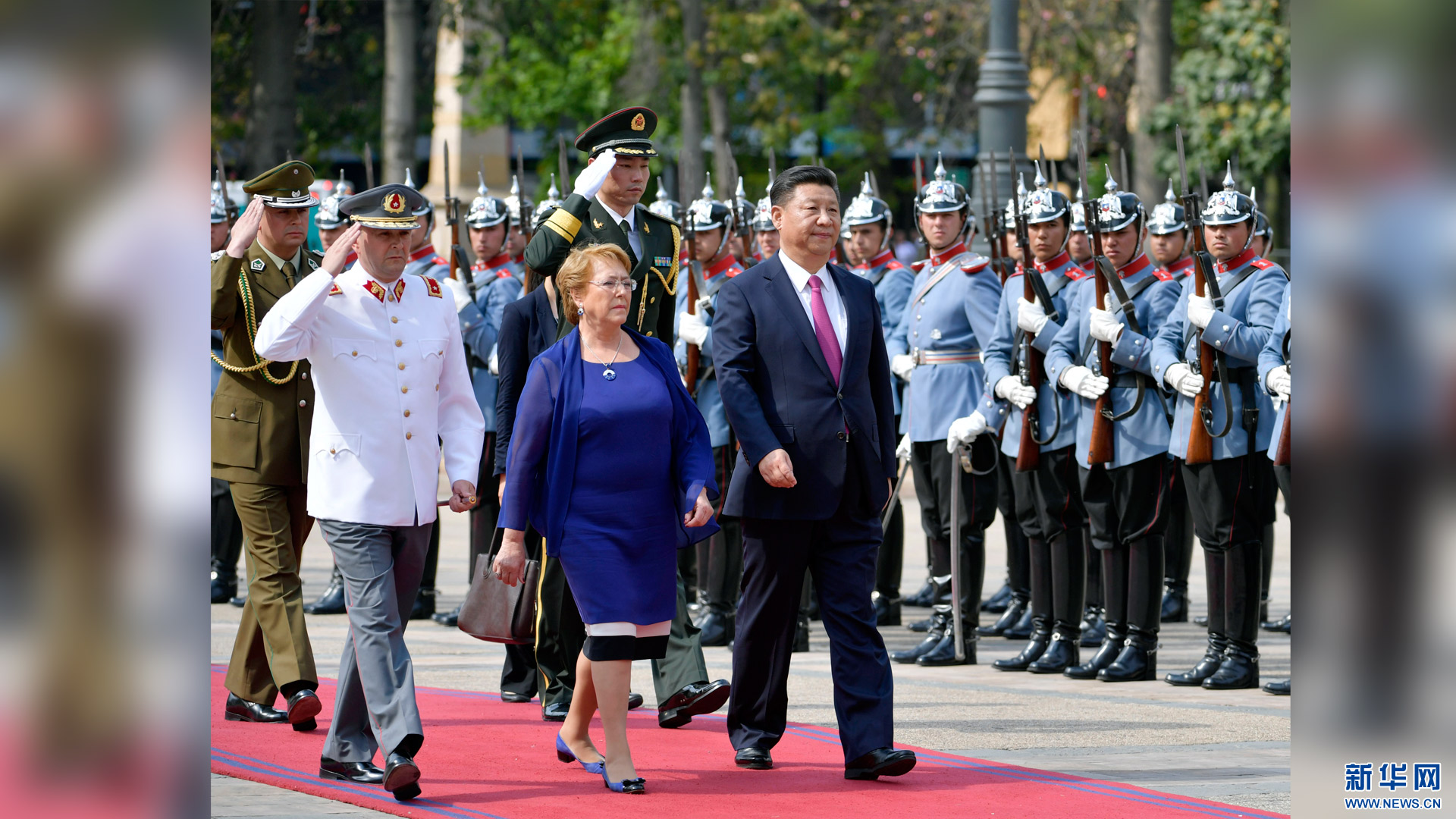 11月22日,國家主席習近平在圣地亞哥同智利總統(tǒng)巴切萊特舉行會談。這是會談前,習近平出席巴切萊特在憲法廣場舉行的隆重歡迎儀式。新華社記者 王曄 攝2016-11-23