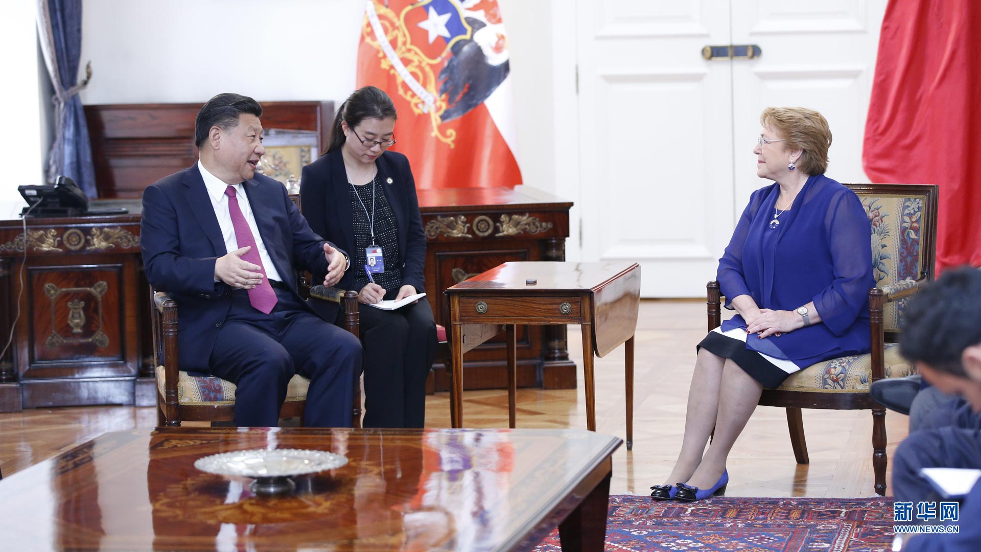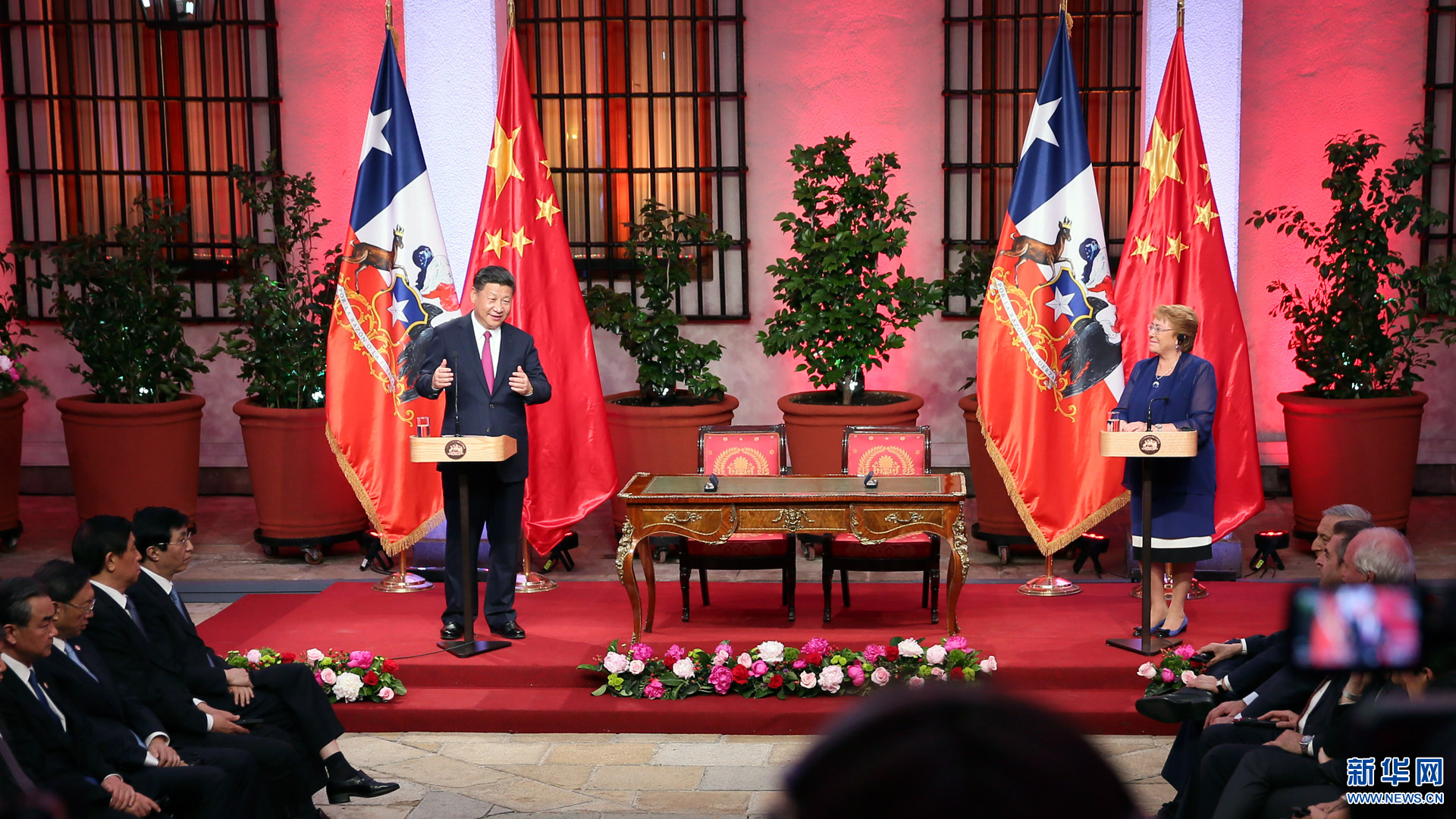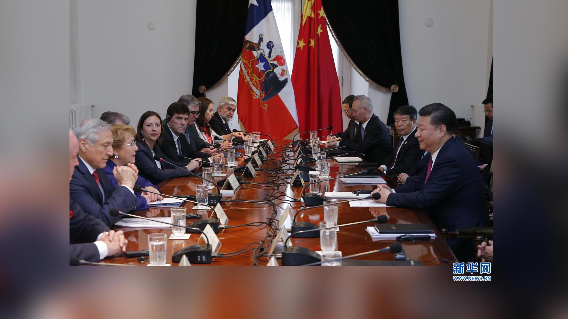 11月22日,國家主席習近平在圣地亞哥同智利總統(tǒng)巴切萊特舉行會談。 新華社記者 鞠鵬 攝2016-11-23