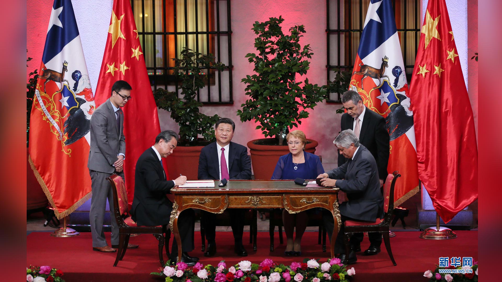11月22日,國家主席習近平在圣地亞哥同智利總統(tǒng)巴切萊特舉行會談。這是會談后,兩國元首見證經貿、農業(yè)、質檢、文化、教育、電子商務、信息通信、金融等領域多項雙邊合作文件的簽署。新華社記者 蘭紅光 攝2016-11-23