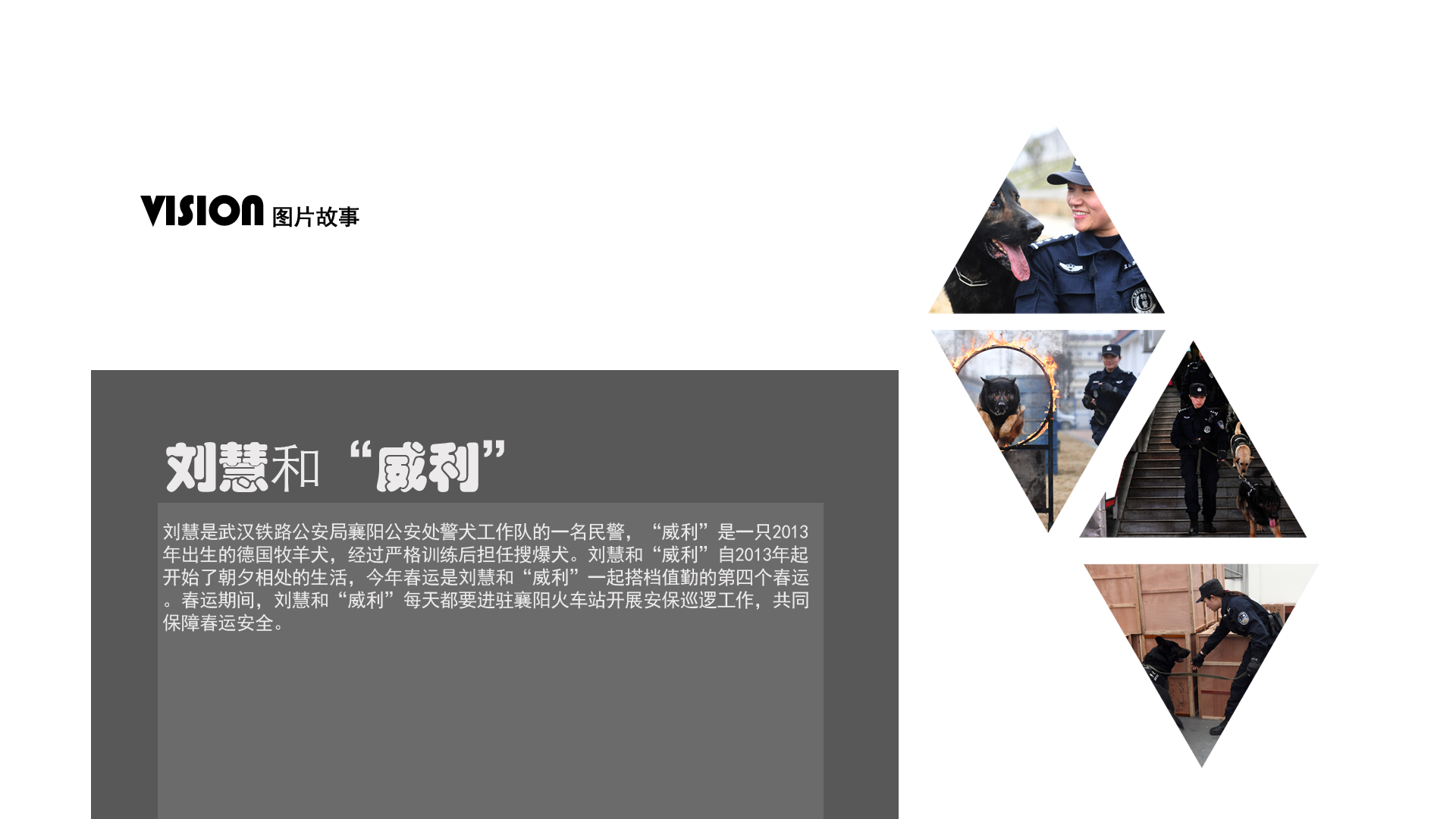 2月5日,劉慧和“威利”在警犬基地玩耍。劉慧是武漢鐵路公安局襄陽公安處警犬工作隊(duì)的一名民警,“威利”是一只2013年出生的德國牧羊犬,經(jīng)過嚴(yán)格訓(xùn)練后擔(dān)任搜爆犬。劉慧和“威利”自2013年起開始了朝夕相處的生活,今年春運(yùn)是劉慧和“威利”一起搭檔值勤的第四個(gè)春運(yùn)。春運(yùn)期間,劉慧和“威利”每天都要進(jìn)駐襄陽火車站開展安保巡邏工作,共同保障春運(yùn)安全。 新華社記者 程敏 攝