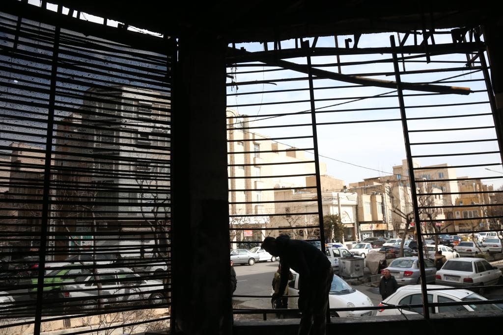 1月21日,在伊朗首都德黑兰,一名男子站在近期骚乱事件中受损的银行内。