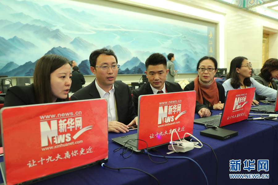 2017年10月17日下午,中國共產(chǎn)黨第十九次全國代表大會新聞發(fā)言人在人民大會堂三樓金色大廳舉行新聞發(fā)布會,并回答中外記者的提問。圖為新華網(wǎng)記者在做直播準(zhǔn)備。新華網(wǎng) 翟子赫 攝