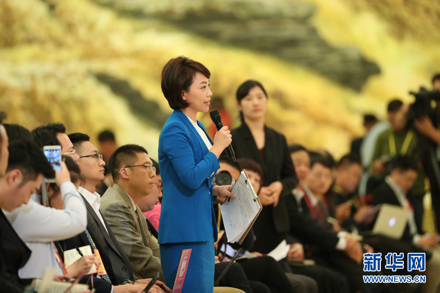 2017年10月17日下午,中國共產(chǎn)黨第十九次全國代表大會(huì)新聞發(fā)言人在人民大會(huì)堂三樓金色大廳舉行新聞發(fā)布會(huì),并回答中外記者提問。圖為中央電視臺(tái)記者提問。新華網(wǎng) 翟子赫 攝