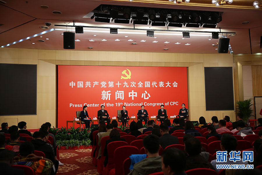 ??? 10月19日,十九大新聞中心舉辦集體采訪,邀請(qǐng)政法戰(zhàn)線代表談全面推進(jìn)依法治國。圖為采訪現(xiàn)場(chǎng)。新華網(wǎng) 郝廣鵬攝