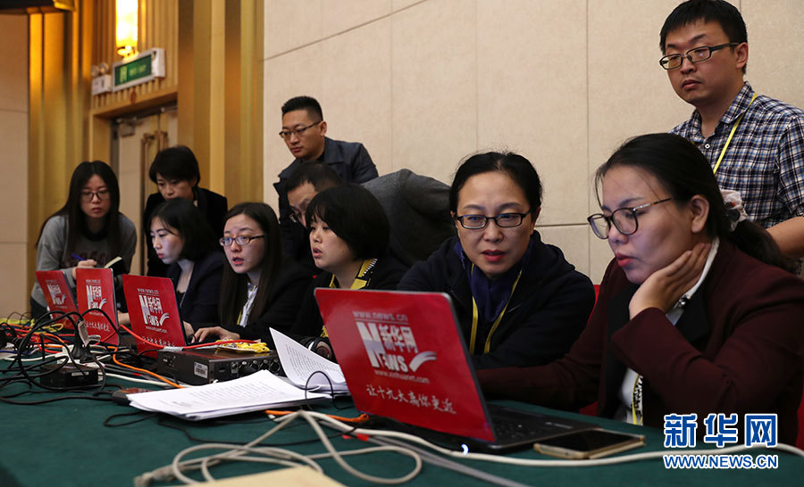 ??? 10月20日,十九大新聞中心舉行記者會,邀請中宣部、中央文明辦、文化部、新聞出版廣電總局相關(guān)負(fù)責(zé)人介紹加強(qiáng)思想道德和文化建設(shè)情況,并回答記者提問。圖為新華網(wǎng)在現(xiàn)場直播。新華網(wǎng) 郝廣鵬 攝