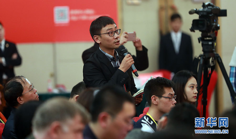 ??? 10月20日,十九大新聞中心舉辦集體采訪活動(dòng),主題為“文化發(fā)展開創(chuàng)新局面”。圖為光明日報(bào)融媒體記者提問。新華網(wǎng) 翟子赫攝