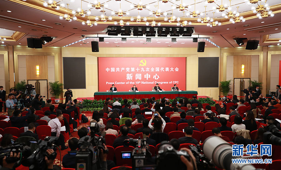 10月21日,十九大新聞中心舉辦記者招待會,邀請中共中央統(tǒng)戰(zhàn)部常務副部長張裔炯、副部長冉萬祥,中共中央對外聯(lián)絡部副部長郭業(yè)洲介紹黨的統(tǒng)一戰(zhàn)線工作和黨的對外交往情況,并回答記者提問。圖為記者招待會現(xiàn)場。新華網 郝廣鵬攝