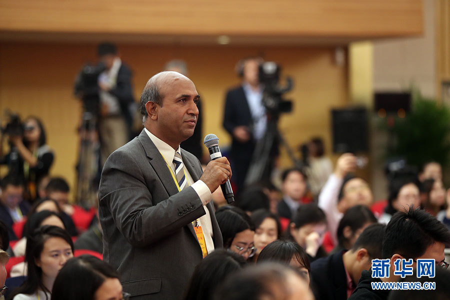 10月21日,十九大新聞中心舉辦記者招待會(huì),邀請中共中央統(tǒng)戰(zhàn)部常務(wù)副部長張裔炯、副部長冉萬祥,中共中央對外聯(lián)絡(luò)部副部長郭業(yè)洲介紹黨的統(tǒng)一戰(zhàn)線工作和黨的對外交往情況,并回答記者提問。圖為巴基斯坦聯(lián)合通訊社記者提問。新華網(wǎng) 郝廣鵬攝