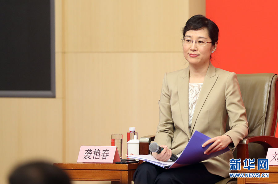 10月22日,十九大新聞中心在梅地亞中心二層新聞發(fā)布廳舉辦集體采訪活動(dòng),主題為“中國特色強(qiáng)軍之路邁出堅(jiān)定步伐”。圖為主持人襲艷春。新華網(wǎng) 郝廣鵬攝
