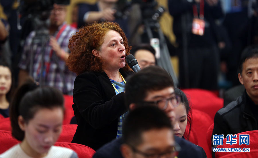 10月22日,十九大新聞中心在梅地亞中心二層新聞發(fā)布廳舉辦集體采訪活動(dòng),主題為“中國(guó)特色強(qiáng)軍之路邁出堅(jiān)定步伐”。圖為意大利24小時(shí)太陽(yáng)報(bào)記者提問。新華網(wǎng) 郝廣鵬攝
