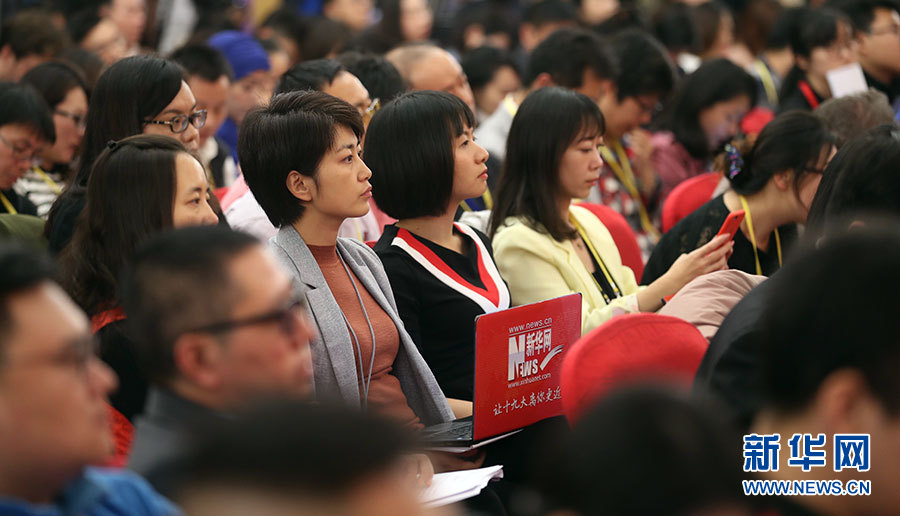 10月23日,十九大新聞中心舉辦記者招待會,邀請中央財(cái)經(jīng)領(lǐng)導(dǎo)小組辦公室副主任楊偉民,環(huán)境保護(hù)部黨組書記、部長李干杰介紹踐行綠色發(fā)展理念,建設(shè)美麗中國有關(guān)情況,并回答記者提問。圖為現(xiàn)場記者。新華網(wǎng) 郝廣鵬攝