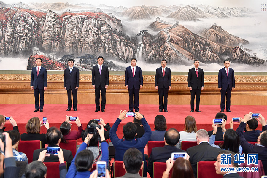 10月25日,黨的十九屆中央委員會(huì)第一次全體會(huì)議新選出的中央政治局常委同中外記者見(jiàn)面。新華社記者 李濤 攝