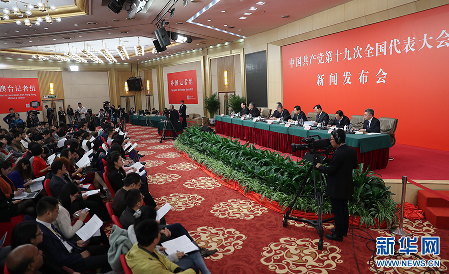 10月26日上午10:00,中國共產(chǎn)黨第十九次全國代表大會(huì)新聞發(fā)言人在梅地亞賓館二層新聞發(fā)布廳召開專題新聞發(fā)布會(huì),請(qǐng)有關(guān)方面負(fù)責(zé)人解讀十九大報(bào)告,并回答記者關(guān)心的問題。圖為新聞發(fā)布會(huì)現(xiàn)場(chǎng)。新華網(wǎng) 翟子赫 攝