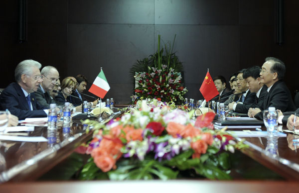 ??? 11月5日,中國國務(wù)院總理溫家寶在老撾首都萬象會(huì)見出席第九屆亞歐首腦會(huì)議的意大利總理蒙蒂。 新華社記者張鐸攝