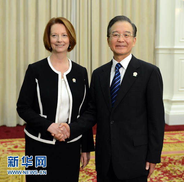11月20日,國(guó)務(wù)院總理溫家寶在金邊會(huì)見(jiàn)澳大利亞總理吉拉德。新華社記者張鐸攝