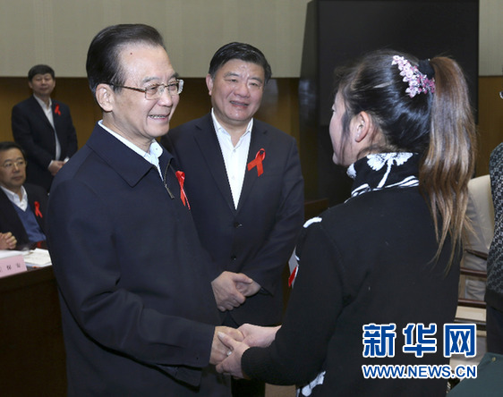 ????11月30日,國(guó)務(wù)院總理溫家寶在北京中南海與艾滋病感染者、艾滋病致孤兒童、上訪人員、醫(yī)務(wù)人員、科研人員、志愿者和有關(guān)國(guó)際組織代表座談。這是座談會(huì)前,溫家寶與艾滋病感染者握手交談。(來(lái)源:新華社記者 龐興雷 攝)
