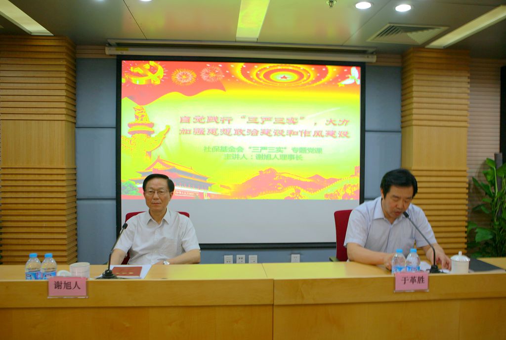 5月25日下午,全國社會保障基金理事會謝旭人理事長為全體干部職工講授了題為“自覺踐行三嚴(yán)三實,大力加強思想政治建設(shè)和作風(fēng)建設(shè)”的專題黨課,同時對開展“三嚴(yán)三實”專題教育進行了動員。于革勝副理事長主持會議,中央組織部干部四局張晨光同志應(yīng)邀參加。