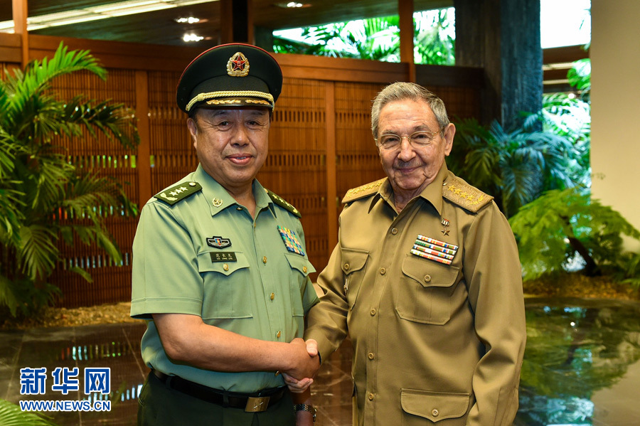 ?? 6月15日,古巴國務(wù)委員會(huì)主席兼部長會(huì)議主席勞爾·卡斯特羅(右)在首都哈瓦那會(huì)見正在古巴訪問的中央軍委副主席范長龍。 新華社發(fā)
