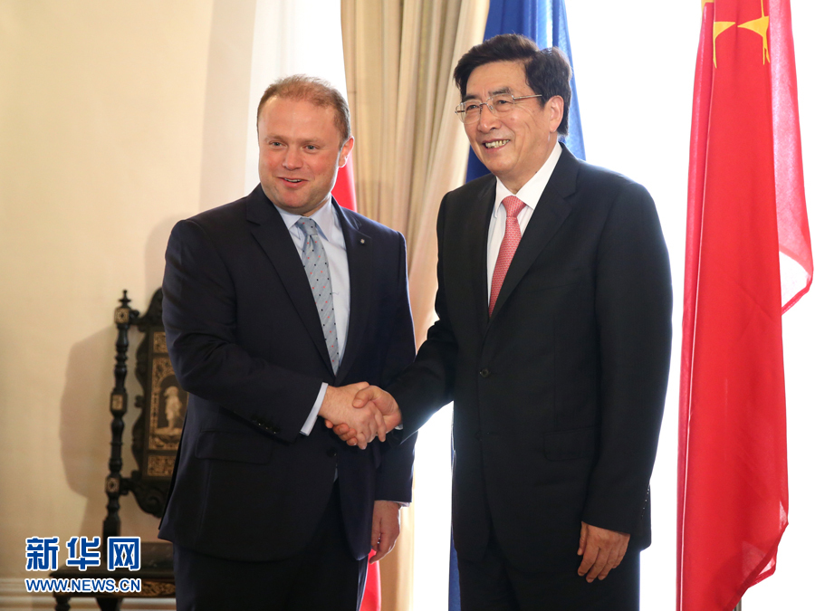 ??? 6月16日,在馬耳他首都瓦萊塔的總理府,郭金龍會(huì)見(jiàn)馬耳他總理穆斯卡特(左)。應(yīng)邀對(duì)馬耳他進(jìn)行友好訪問(wèn)的中共中央政治局委員、北京市委書(shū)記郭金龍16日在瓦萊塔分別會(huì)見(jiàn)馬耳他總統(tǒng)普雷卡和總理、工黨領(lǐng)袖穆斯卡特?! ⌒氯A社記者李佳攝