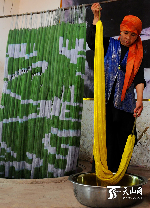 而今,這種技法漸漸被注入新鮮血液。6月底,當(dāng)記者走進(jìn)吉亞鄉(xiāng)喀了塔吐格曼村家庭作坊,在院子里看見正在染色的艾比比班 卡斯木。一蘸、一染、一擰、一轉(zhuǎn),一套動作下來就能浸染一小段艾德萊斯了,有了現(xiàn)成的絲線和染料后,這項(xiàng)神秘扎染技藝顯得更加快捷了,村民們也樂于接受這種高效的生產(chǎn)模式。