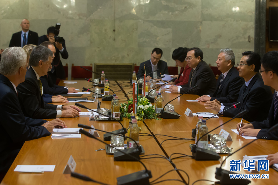 ??? 9月11日,中共中央書(shū)記處書(shū)記、中央紀(jì)委副書(shū)記趙洪祝(右二)在匈牙利首都布達(dá)佩斯會(huì)見(jiàn)匈牙利國(guó)會(huì)主席克韋爾(左二)。應(yīng)匈牙利執(zhí)政黨青民盟邀請(qǐng),中共中央書(shū)記處書(shū)記、中央紀(jì)委副書(shū)記趙洪祝率中共代表團(tuán)于9月10日至11日訪(fǎng)問(wèn)匈牙利。新華社發(fā)(弗爾季·奧蒂洛攝)