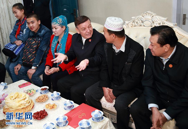 ????9月28日,全國人大常委會副委員長、中央代表團副團長艾力更·依明巴海率中央代表團三分團在昌吉回族自治州、烏魯木齊市看望慰問當(dāng)?shù)馗髯甯刹咳罕?。這是艾力更·依明巴海在昌吉市榆樹溝鎮(zhèn)閔昌回民新村看望回族村民丁虎一家。新華社記者丁海濤攝