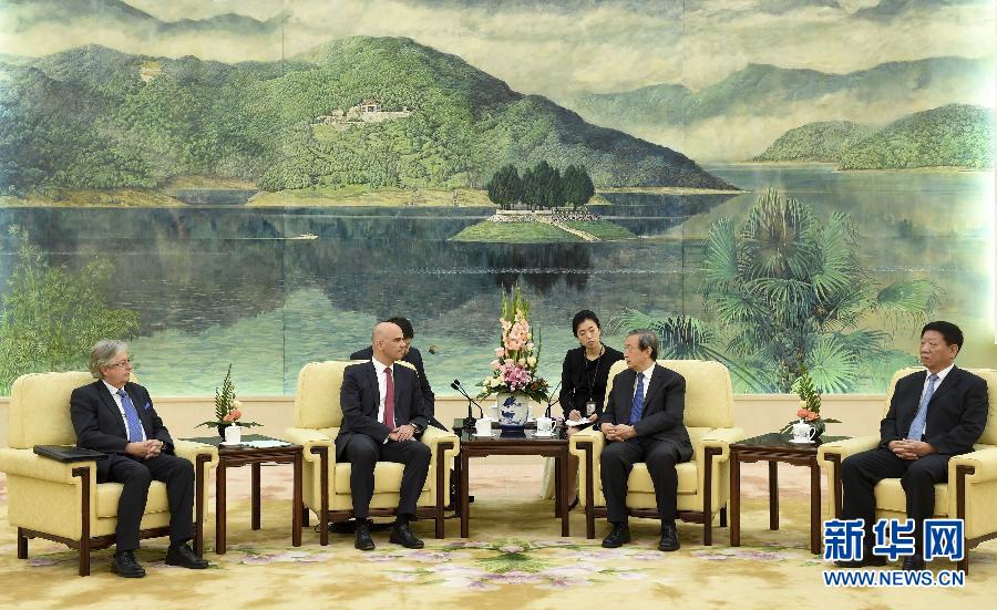 ??? 9月30日,國(guó)務(wù)院副總理馬凱在北京人民大會(huì)堂會(huì)見(jiàn)來(lái)訪的瑞士聯(lián)邦委員兼內(nèi)政部長(zhǎng)阿蘭·貝爾塞一行。 新華社記者 張鐸 攝