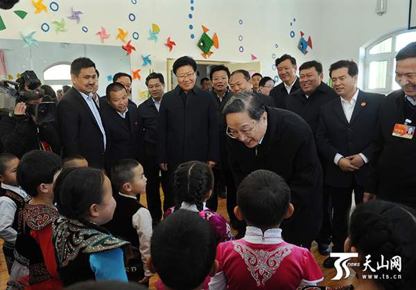 俞正聲仔細聽取新村牧民定居建設情況介紹,走進新村幼兒園送上益智玩具等幼教器具,觀看教學點雙語教學,與小朋友們一起拍手唱兒歌《小兔兒乖乖》,聽二年級學生朗誦童謠《我的家鄉(xiāng)也拉曼》,氣氛幸福溫暖。