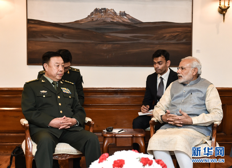 ??? 11月17日,正在印度訪問的中央軍委副主席范長龍(前左)在新德里會(huì)見印度總理莫迪(前右)。 新華社發(fā)