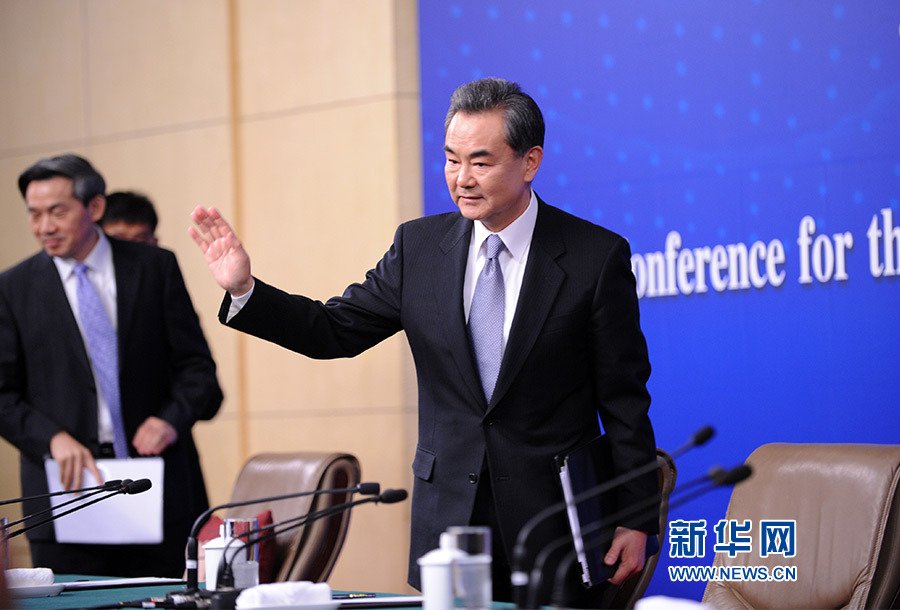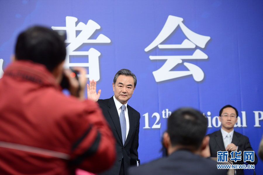 ????十二屆全國人大三次會議新聞中心于3月8日(星期日)10時(shí)在梅地亞中心多功能廳舉行記者會,邀請外交部部長王毅就中國的外交政策和對外關(guān)系相關(guān)問題回答中外記者提問。圖為外交部部長王毅同記者揮手道別。新華網(wǎng)/中國政府網(wǎng) 翟子赫 攝
