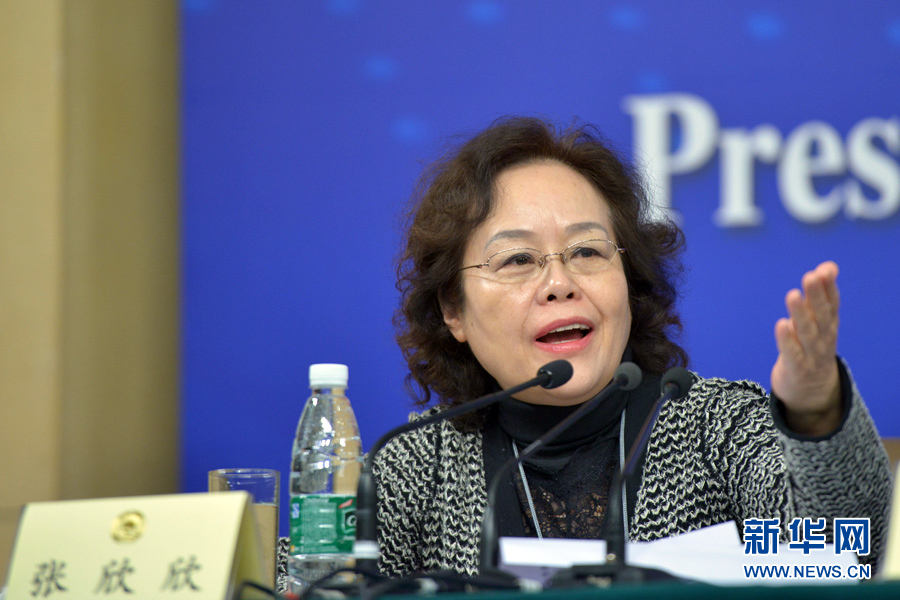 ??? 全國政協(xié)十二屆三次會議舉行記者會,邀請全國政協(xié)常委朱維群、黃潔夫和全國政協(xié)委員胡曉義、李彥宏、俞敏洪等談促進(jìn)民生改善與社會和諧穩(wěn)定,并回答記者提問。圖為記者會主持人張欣欣。新華網(wǎng)/中國政府網(wǎng) 郭小天 攝