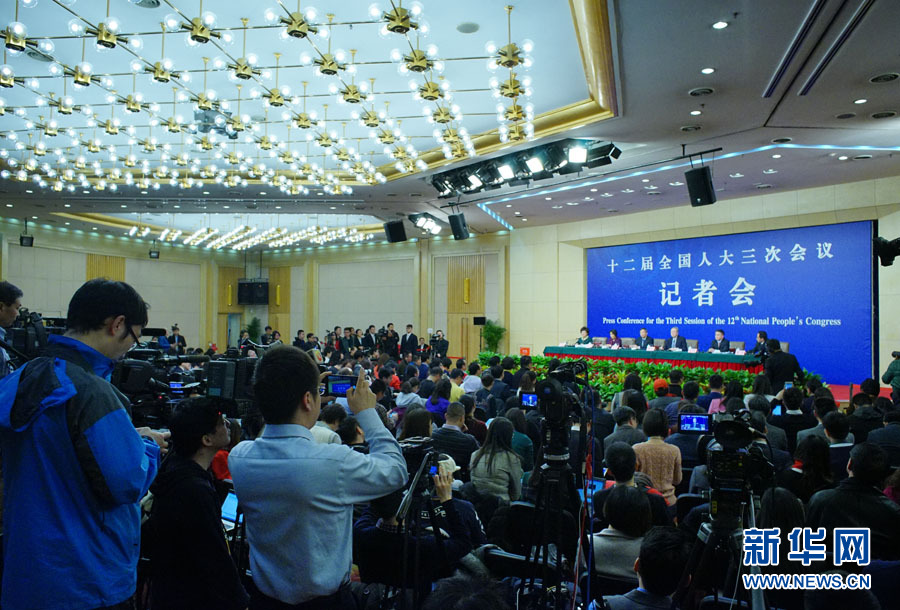 ????十二屆全國(guó)人大三次會(huì)議新聞中心于3月12日在梅地亞中心多功能廳舉行記者會(huì),邀請(qǐng)中國(guó)人民銀行行長(zhǎng)周小川,中國(guó)人民銀行副行長(zhǎng)、國(guó)家外匯管理局局長(zhǎng)易綱,中國(guó)人民銀行副行長(zhǎng)潘功勝,絲路基金有限責(zé)任公司董事長(zhǎng)金琦就金融改革與發(fā)展回答中外記者提問。圖為記者會(huì)現(xiàn)場(chǎng)。新華網(wǎng)/中國(guó)政府網(wǎng) 郭小天攝