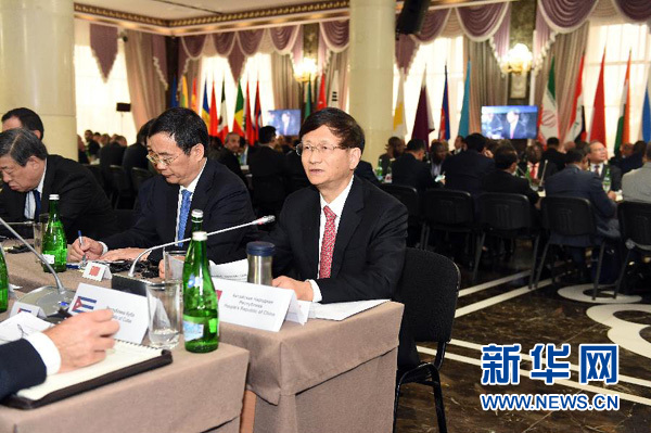 5月24日,在俄羅斯車臣共和國(guó)首府格羅茲尼,中共中央政治局委員、中央政法委書(shū)記孟建柱(前右一)在第七屆安全事務(wù)高級(jí)代表國(guó)際會(huì)議上發(fā)言。中共中央政治局委員、中央政法委書(shū)記孟建柱24日在俄羅斯車臣出席第七屆安全事務(wù)高級(jí)代表國(guó)際會(huì)議。來(lái)自70余個(gè)國(guó)家和國(guó)際組織的代表就深化國(guó)際安全合作、有效應(yīng)對(duì)恐怖主義等問(wèn)題進(jìn)行探討。新華社發(fā)(郝帆攝)
