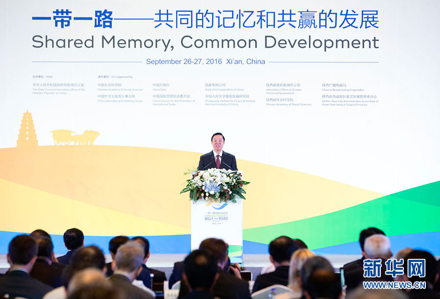 ??? 9月26日,2016“一帶一路”國際研討會(huì)在西安召開,中共中央政治局委員、中央書記處書記、中宣部部長(zhǎng)劉奇葆出席研討會(huì),發(fā)表題為《促進(jìn)民心相通 實(shí)現(xiàn)合作共贏》的主旨演講。新華社記者 丁林 攝