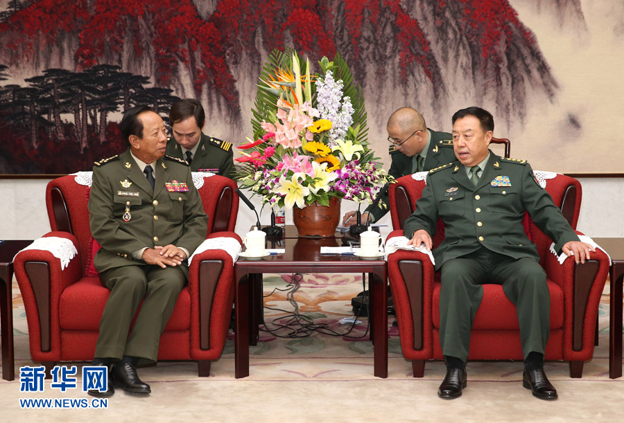 ??? 10月13日,中央軍委副主席范長龍?jiān)诒本?huì)見柬埔寨王國副首相兼國防大臣迪班。 新華社記者 馬占成 攝