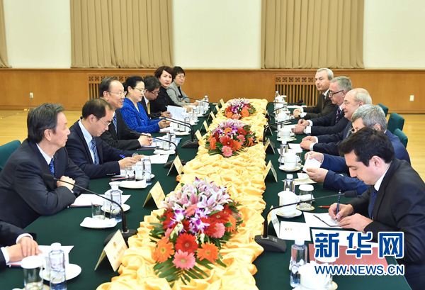 11月3日,中共中央書記處書記、全國政協(xié)副主席、中國經(jīng)濟(jì)社會理事會主席杜青林在北京與亞美尼亞公眾院主席馬努基揚(yáng)會談。 新華社記者 李濤攝