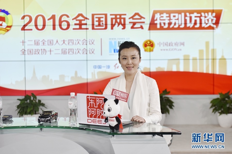 2016年3月12日,全國人大代表、正邦集團董事局主席、總裁林印孫做客新華網(wǎng)兩會訪談直播間。圖為新華網(wǎng)主持人張姣。新華網(wǎng) 郭小天 攝