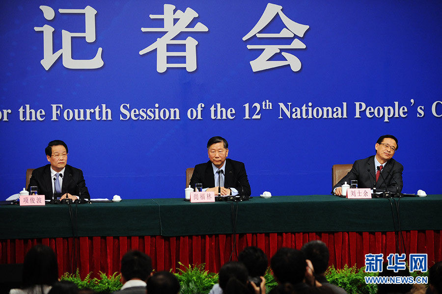 3月12日,十二屆全國人大四次會議在梅地亞中心多功能廳舉行記者會,邀請中國銀行業(yè)監(jiān)督管理委員會主席尚福林、中國證券監(jiān)督管理委員會主席劉士余、中國保險監(jiān)督管理委員會主席項俊波回答中外記者的提問。圖為記者會主席臺。新華網(wǎng)/中國政府網(wǎng) 陳杰 攝
