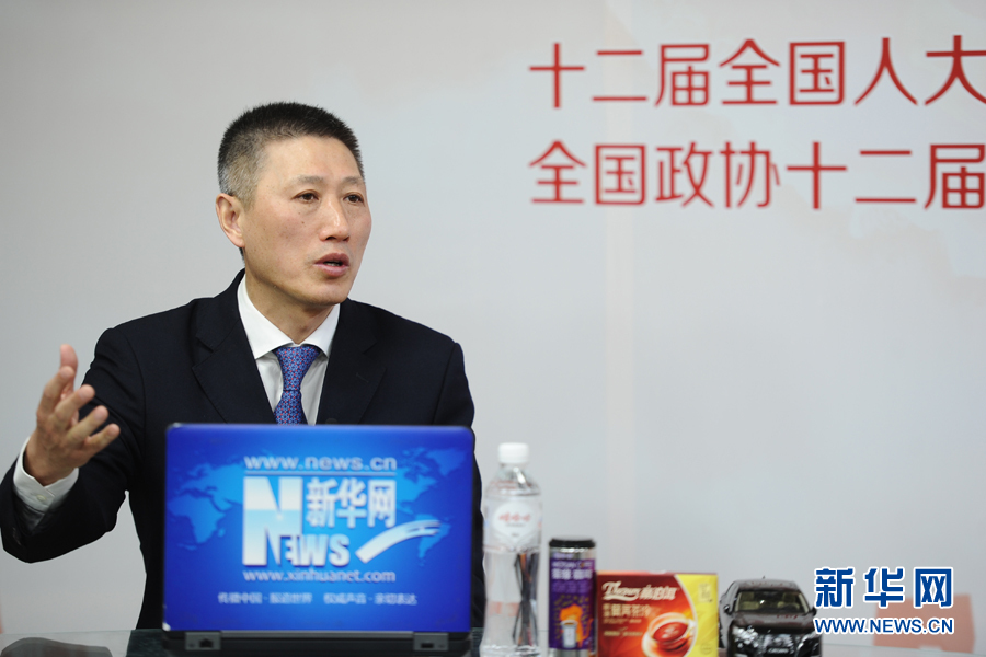 ??? 2016年3月13日,全國人大代表,煙臺張裕葡萄釀酒股份有限公司總經(jīng)理周洪江做客新華網(wǎng)兩會訪談。圖為周洪江在訪談現(xiàn)場。新華網(wǎng) 盧志佳 攝