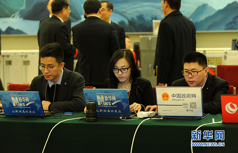 3月16日上午,國務(wù)院總理李克強在人民大會堂三樓金色大廳會見采訪十二屆全國人大四次會議的中外記者并回答記者提出的問題。圖為新華網(wǎng)、中國政府網(wǎng)記者在做直播準備。新華網(wǎng)/中國政府網(wǎng) 陳競超 攝