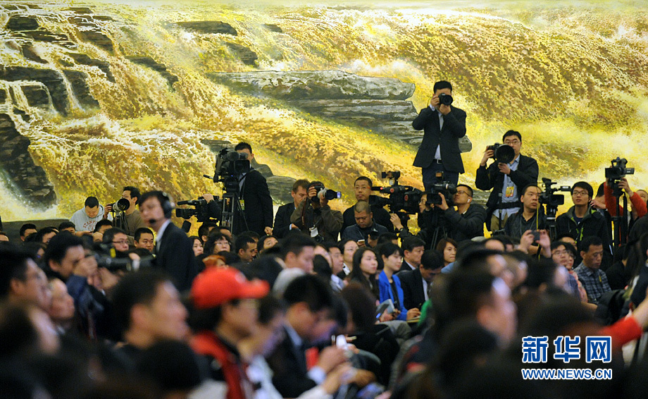 3月16日上午,國務(wù)院總理李克強在人民大會堂三樓金色大廳會見采訪十二屆全國人大四次會議的中外記者并回答記者提出的問題。圖為記者會現(xiàn)場。新華網(wǎng)/中國政府網(wǎng) 陳競超 攝