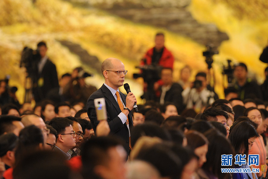 3月16日上午,國(guó)務(wù)院總理李克強(qiáng)在人民大會(huì)堂三樓金色大廳會(huì)見(jiàn)采訪(fǎng)十二屆全國(guó)人大四次會(huì)議的中外記者并回答記者提出的問(wèn)題。圖為彭博新聞社記者提問(wèn)。新華網(wǎng)/中國(guó)政府網(wǎng) 陳杰攝