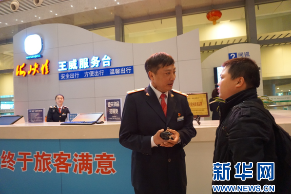 春運期間,火車站客流量陡增,在擁擠的人潮中,藏藍(lán)色的身影會讓旅客的內(nèi)心平添一份安定?!澳?,請問有什么可以幫您”,“您這趟車快到檢票時間了,2號進(jìn)站口人稍微少一點”,“退票請帶身份證到5號窗口”。兩小時下來,這樣的話王威重復(fù)了成百上千次,手上水杯里的水卻幾乎未少。
